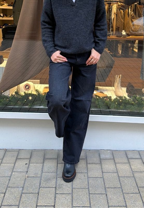 Aux pieds, on tranche avec des boots Semerdjian en cuir noir. Avec leur semelle crantée affirmée, elles confèrent à l’ensemble cette dose de sophistication et de caractère qui signe un look réussi. Le chic ? C’est la simplicité bien exécutée.